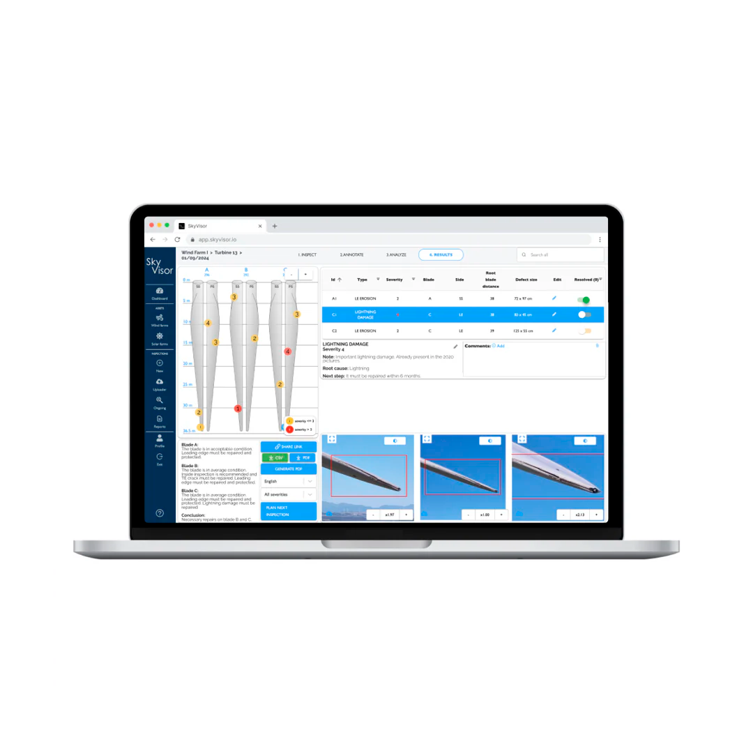 ¡Toma el control del proceso de inspección hoy y optimiza la toma de decisiones con SkyVisor Wind para una gestión de activos proactiva y rentable!