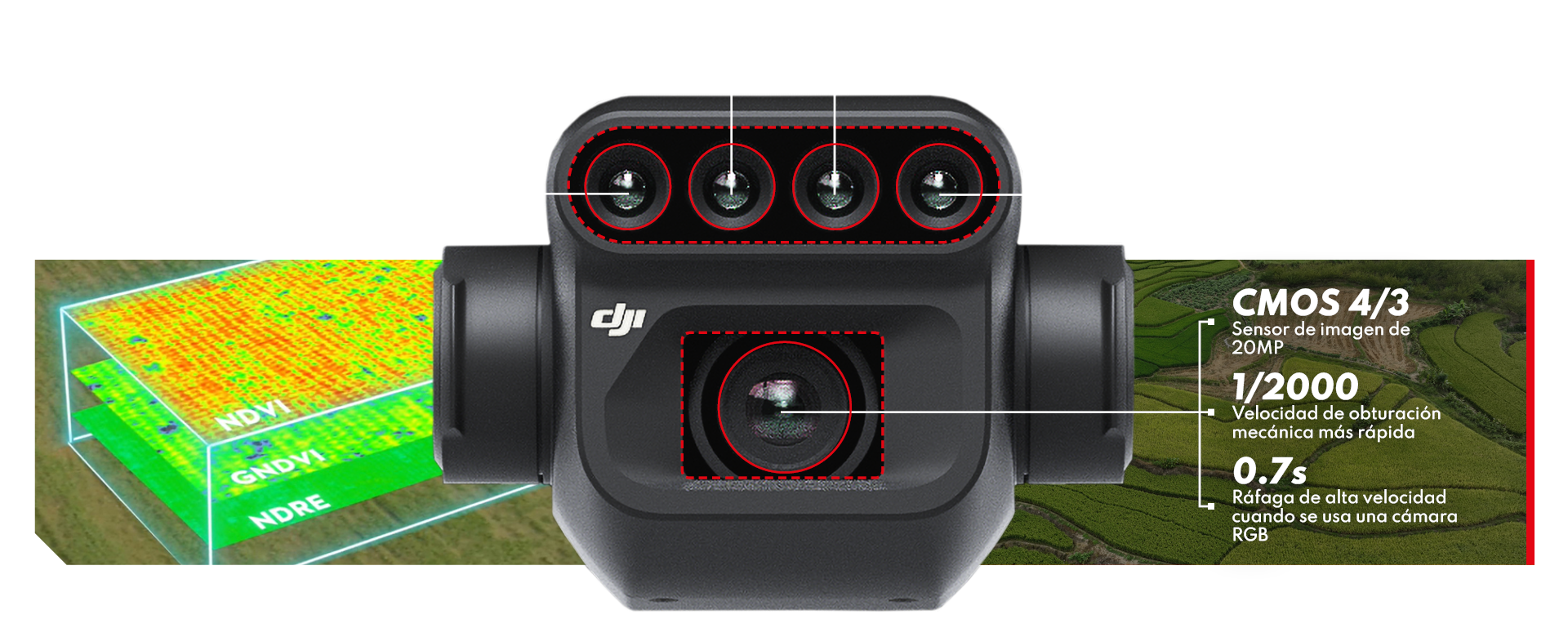 Un nuevo y actualizado sistema de imágenes con una cámara RGB de 20MP y cuatro cámaras multiespectrales de 5MP (verde, rojo, borde rojo e infrarrojo cercano). Habilita aplicaciones tales como representación de alta precisión, monitoreo del crecimiento de cultivos y estudio de recursos naturales.