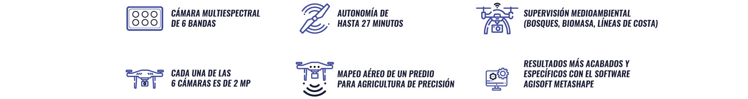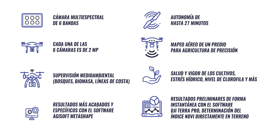El nuevo DJI Phantom 4 MULTISPECTRAL es el mejor equipo para realizar Agricultura de Precisión, es liviano, portátil y fácil de usar, y está equipado con una cámara multiespectral de 6 bandas, cada una de las cuales tiene una resolución de 2 MP. Permite evaluar la salud y el vigor de los cultivos, el estrés hídrico y el nivel de clorofila, a través de diferentes índices como el NDVI, NDRE, OSAVI y otros.