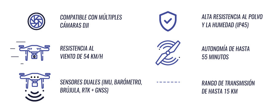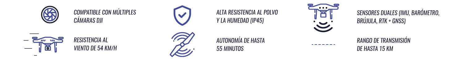 El nuevo DJI Matrice 300 RTK es la más avanzada solución de drones comerciales creada por DJI. Es un equipo de alto rendimiento, robusto, resistente y con altos estándares de seguridad. Ofrece una autonomía de hasta 55 minutos, tiene un sofisticado sistema de sensores anti colisión en 6 direcciones, y es compatible con diversas cámaras propias de DJI y también de terceros. Su capacidad de carga de hasta 2,7 Kg. le permite cargar sensores LiDAR de pequeño tamaño. Es un equipo ideal para labores de inspección inteligente y seguridad pública, a través de las nuevas cámaras DJI H20 y H20T.